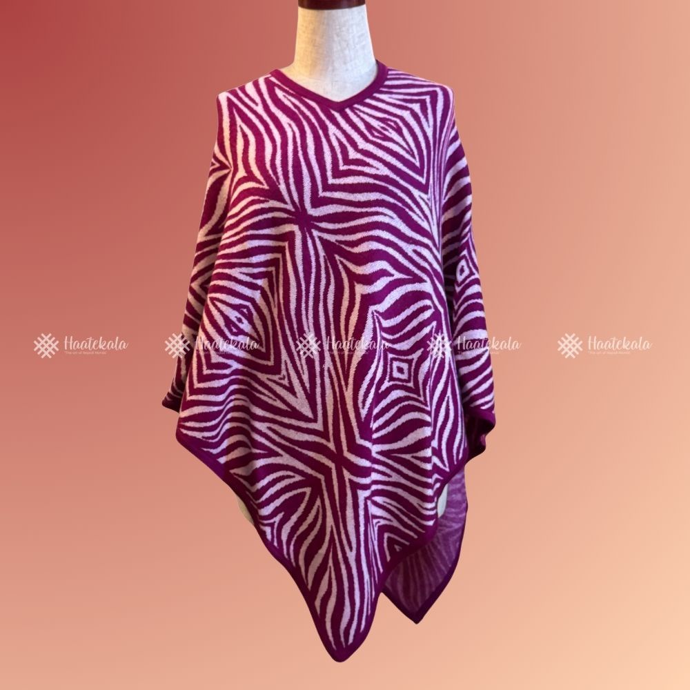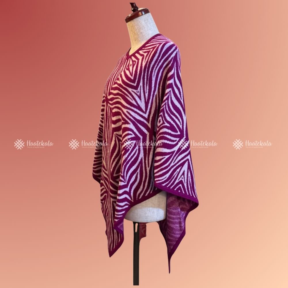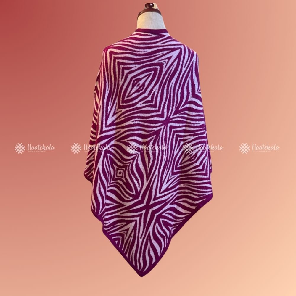 Haatekala’s Pink Pattern Pashmina Poncho is crafted from pure cashmere, known for its warmth, lightness, and luxurious feel. The gentle pink tone combined with soft woven patterns makes it a versatile piece for both casual and formal wear. Handmade in Nepal by skilled artisans, this poncho adds comfort and charm to any wardrobe.